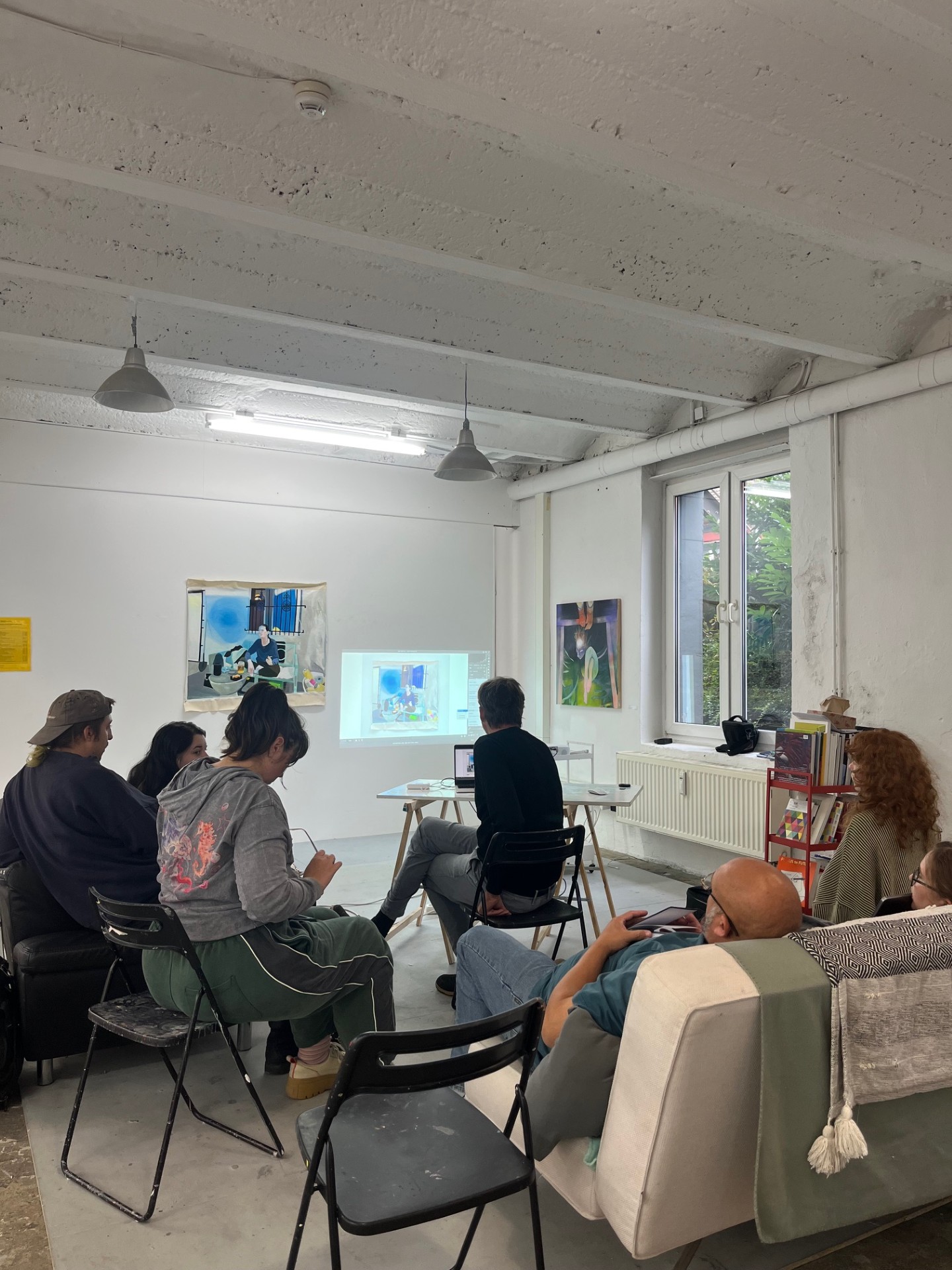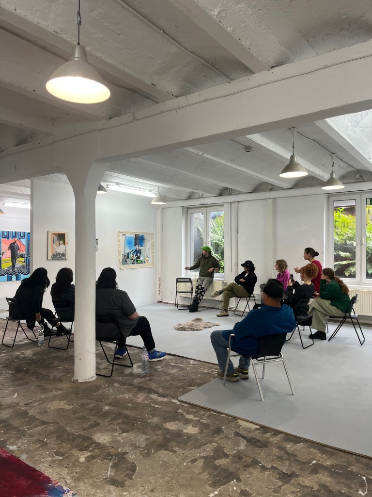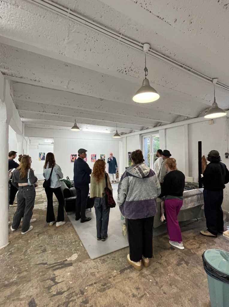 On Friday, September 12, 2025, the 2nd-year MFA cohort took part in an international group crit! Alfred professors Stephanie McMahon, Patrick Brennan, and John Hee Taek Chae made the journey from Alfred, NY, to Düsseldorf, Germany, to join Düsseldorf professors Jutta Haeckel and Stefan Kürten to group critique our work. Alongside the input from the students, it was an intense and insightful session; we discussed content, aesthetics, and installation. As any Alfred graduate painting student can attest, the concerns of art differ between continents. In Alfred, theory and content get their due; in Düsseldorf, aesthetics becomes an elevated concern. The dichotomy between the concerns of American art education and German art student education provides a well-rounded catalyst to consider our work in different contexts.