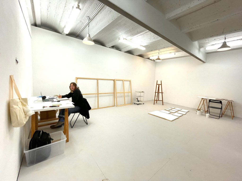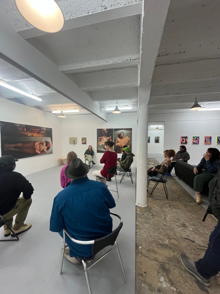 On Thursday, October 23, 2025, the 2nd-year MFA cohort hosted art writer Frank Schlablewski for a group critique. Frank is a creative thinker with a strong knowledge of art history. As the critique settled in, it became clear what the priority was … Frank wanted to find the connection between the artist and the work. He wanted to learn about the artist, view the art, run with his imagination, and challenge each artist to reach an authentic endpoint in their own work. Frank would take a suggestion from a sketchbook and wonder about the painting. Frank would analyze different artworks within an artist’s studio, and express which work was singing most beautifully. He provided insight for each artist to wonder about and take seriously if they see fit to do so.