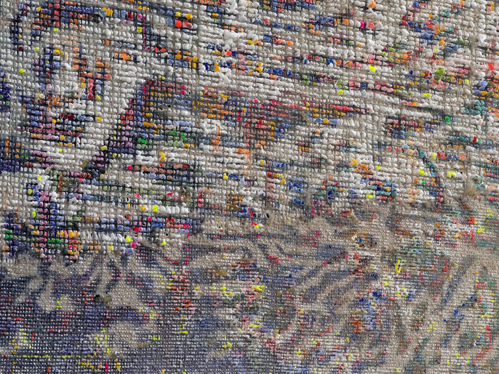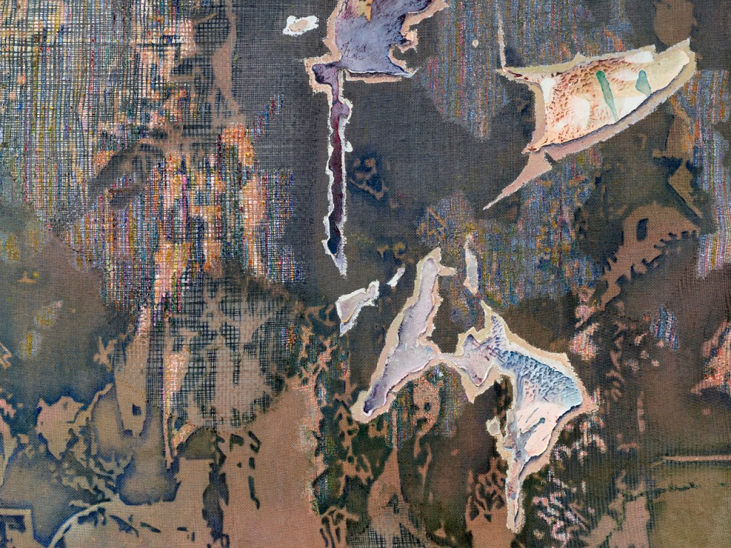Haeckel creates this initial underlying “order” before even beginning to paint, altering the jute that will serve as her canvas by pulling individual threads to make the first rough patterns and shapes. The process that follows involves dyeing, drawing, using masking fluid to protect the drawings, further dyeing, and the application of pastose color and structural sections. The use of a fine brush to give contours to delicate designs transports the abstract into the realm of the concrete, the figurative, the photorealistic. It is a process marked by continuous movement between abstraction and illusion, movement between different visual systems, structures and rules. “The traces or signs of these different systems are,” as Haeckel comments, “at times congruent, at times disparate, which makes them more difficult to read or interpret; it makes what you see, the information, ambiguous.”