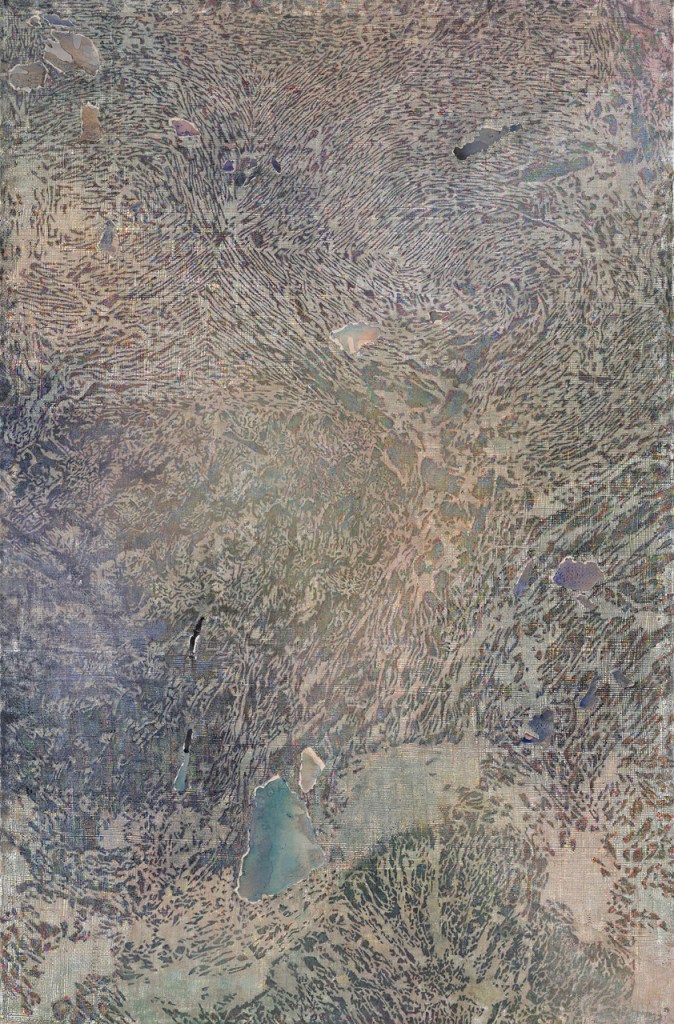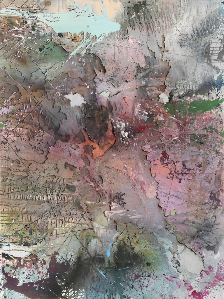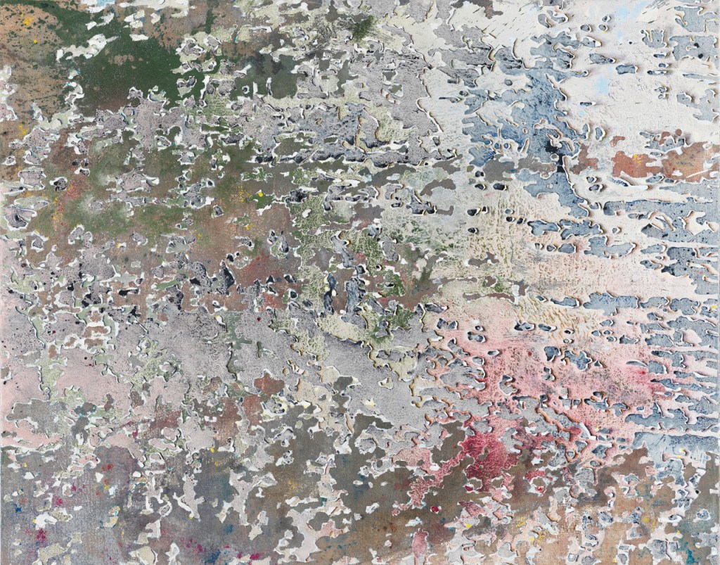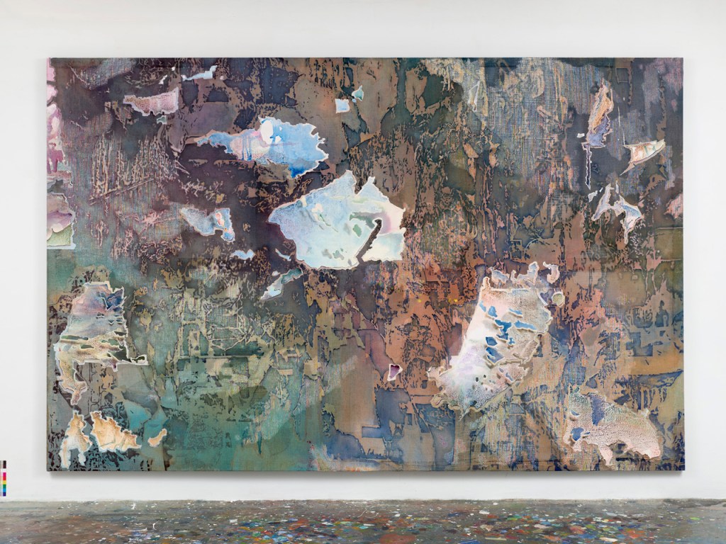 Thus, Clouds is based on a map of the earth that shows what the world might look like after a rise in sea levels, as well as on several microscopy images. The starting point for Glacier, with its layers of color that have been applied and removed, was torn billboards and images of the earth’s sedimentary